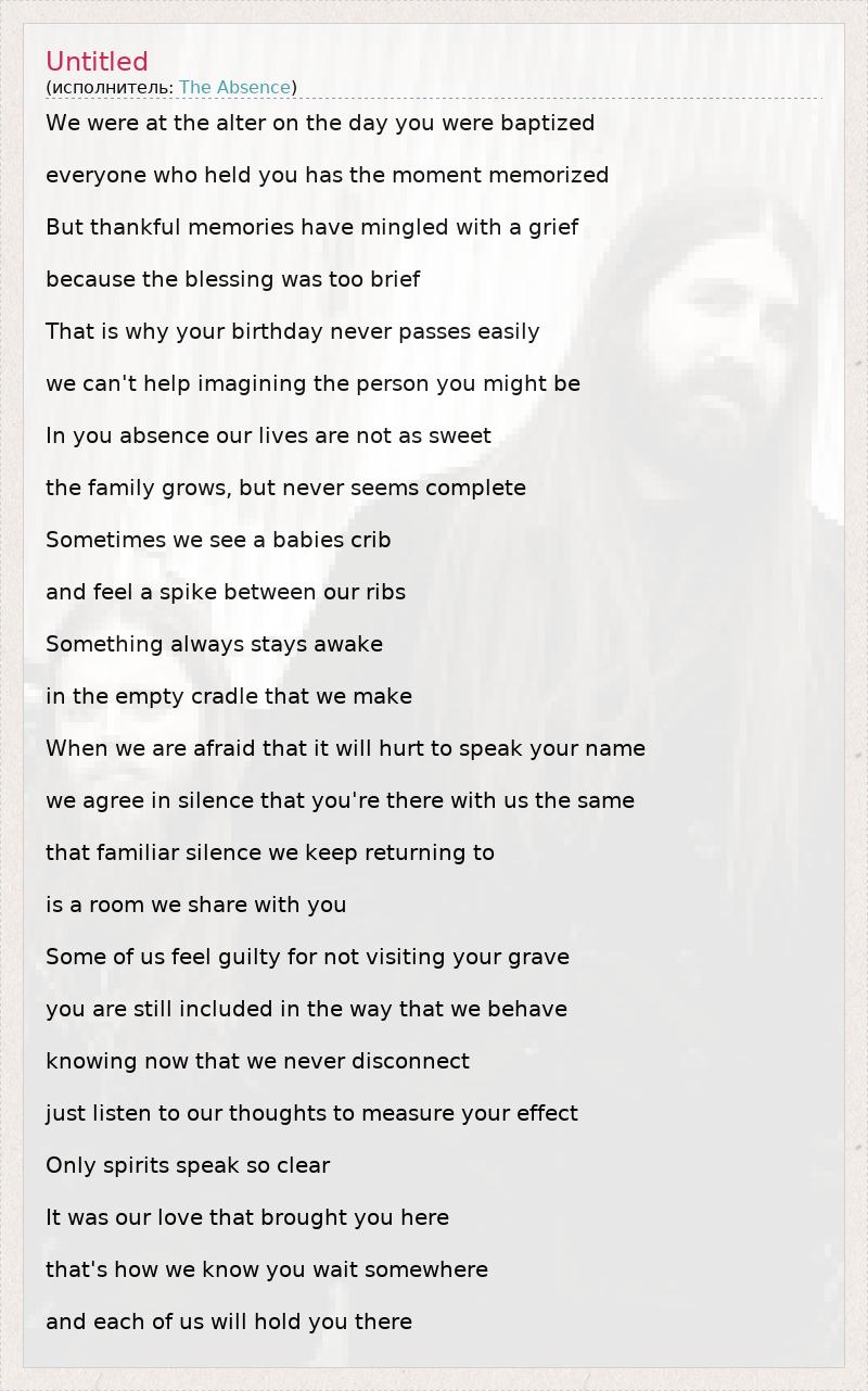 We were at the alter on the day you were baptized everyone who held you has the moment memorized But thankful memories have mingled with a grief because the blessing was too brief That is why your birthday never passes easily we can't help imagining the person you might be In you absence our lives are not as sweet the family grows, but never seems complete Sometimes we see a babies crib and feel a spike between our ribs Something always stays awake in the empty cradle that we make When we are afraid that it will hurt to speak your name we agree in silence that you're there with us the same that familiar silence we keep returning to is a room we share with you Some of us feel guilty for not visiting your grave you are still included in the way that we behave knowing now that we never disconnect just listen to our thoughts to measure your effect Only spirits speak so clear It was our love that brought you here that's how we know you wait somewhere and each of us will hold you there