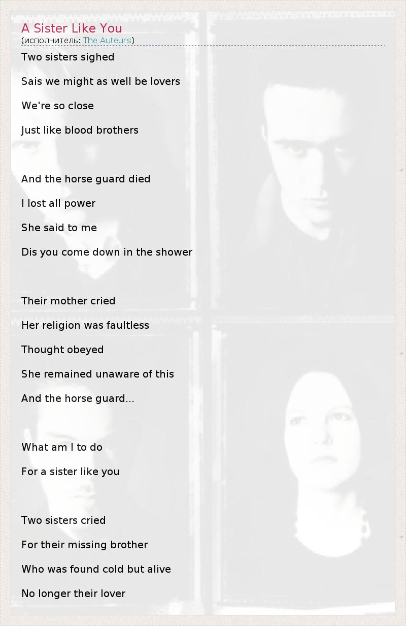 Two sisters sighed Sais we might as well be lovers We're so close Just like blood brothers And the horse guard died I lost all power She said to me Dis you come down in the shower Their mother cried Her religion was faultless Thought obeyed She remained unaware of this And the horse guard... What am I to do For a sister like you Two sisters cried For their missing brother Who was found cold but alive No longer their lover
