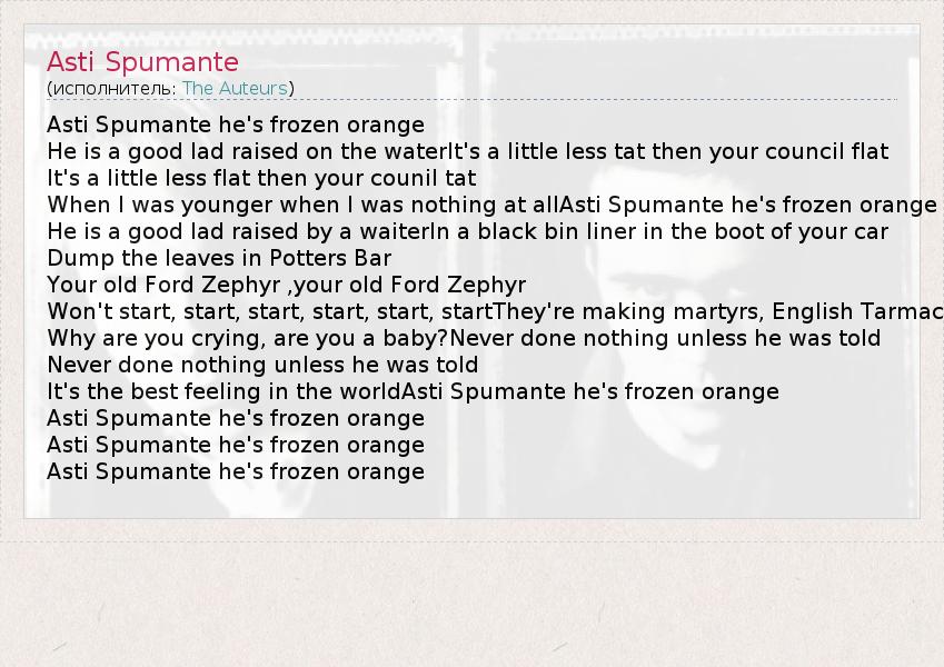 Asti Spumante he's frozen orange He is a good lad raised on the waterIt's a little less tat then your council flat It's a little less flat then your counil tat When I was younger when I was nothing at allAsti Spumante he's frozen orange He is a good lad raised by a waiterIn a black bin liner in the boot of your car Dump the leaves in Potters Bar Your old Ford Zephyr ,your old Ford Zephyr Won't start, start, start, start, start, startThey're making martyrs, English Tarmac Why are you crying, are you a baby?Never done nothing unless he was told Never done nothing unless he was told It's the best feeling in the worldAsti Spumante he's frozen orange Asti Spumante he's frozen orange Asti Spumante he's frozen orange Asti Spumante he's frozen orange