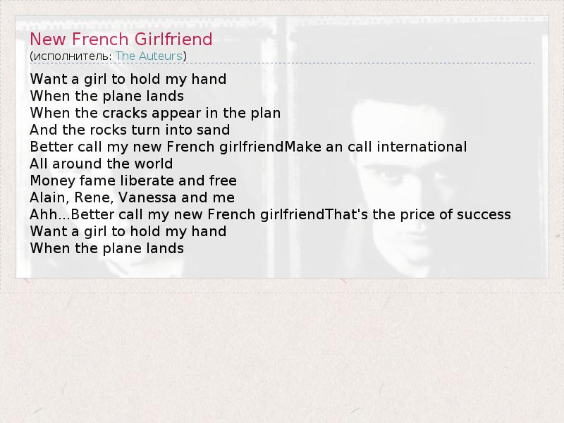Want a girl to hold my hand When the plane lands When the cracks appear in the plan And the rocks turn into sand Better call my new French girlfriendMake an call international All around the world Money fame liberate and free Alain, Rene, Vanessa and me Ahh...Better call my new French girlfriendThat's the price of success Want a girl to hold my hand When the plane lands