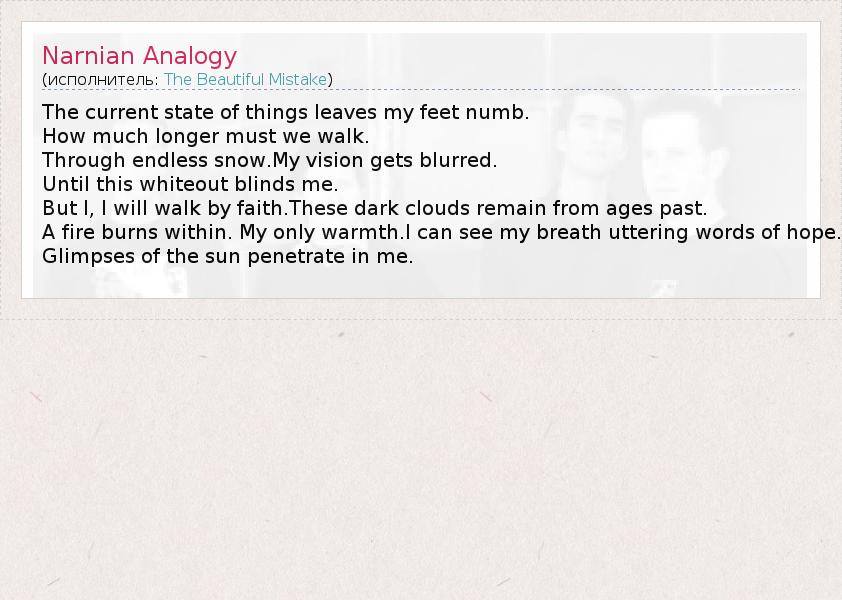 А как ты думаешь, о чем песня "Narnian Analogy" ?