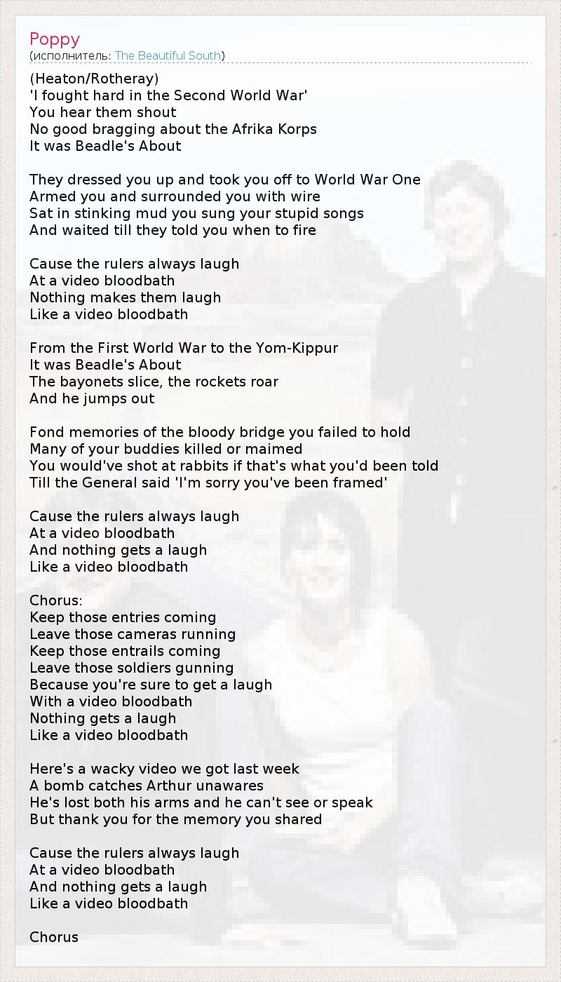 Это интересно:Beautiful South - английская альтернативная поп-рок-группа. Была образована на основе группы HOUSEMARTINS в 1989 в Халле, графство Йоркшир. Состав: вокалист Пол Хитон (Paul Heaton, р. 9 мая 1962, Беркенхед, Мерсисайд), ударник и вокалист Дэвид Хемингуэй (David Hemingway), басист Шон Уэлч (Sean Welch), вокалистка Брайана Корриган (Briana Corrigan), ударник Дэвид Стид (David Stead) и гитарист Дэвид Ротерей (David Rotheray). Популярность группа завоевала... продолжение