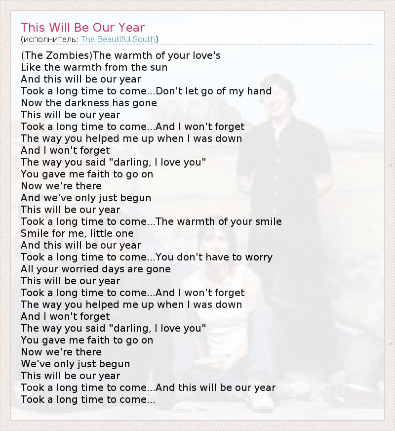(The Zombies)The warmth of your love's Like the warmth from the sun And this will be our year Took a long time to come...Don't let go of my hand Now the darkness has gone This will be our year Took a long time to come...And I won't forget The way you helped me up when I was down And I won't forget The way you said "darling, I love you" You gave me faith to go on Now we're there And we've only just begun This will be our year Took a long time to come...The warmth of your smile Smile for me, little one And this will be our year Took a long time to come...You don't have to worry All your worried days are gone This will be our year Took a long time to come...And I won't forget The way you helped me up when I was down And I won't forget The way you said "darling, I love you" You gave me faith to go on Now we're there We've only just begun This will be our year Took a long time to come...And this will be our year Took a long time to come...