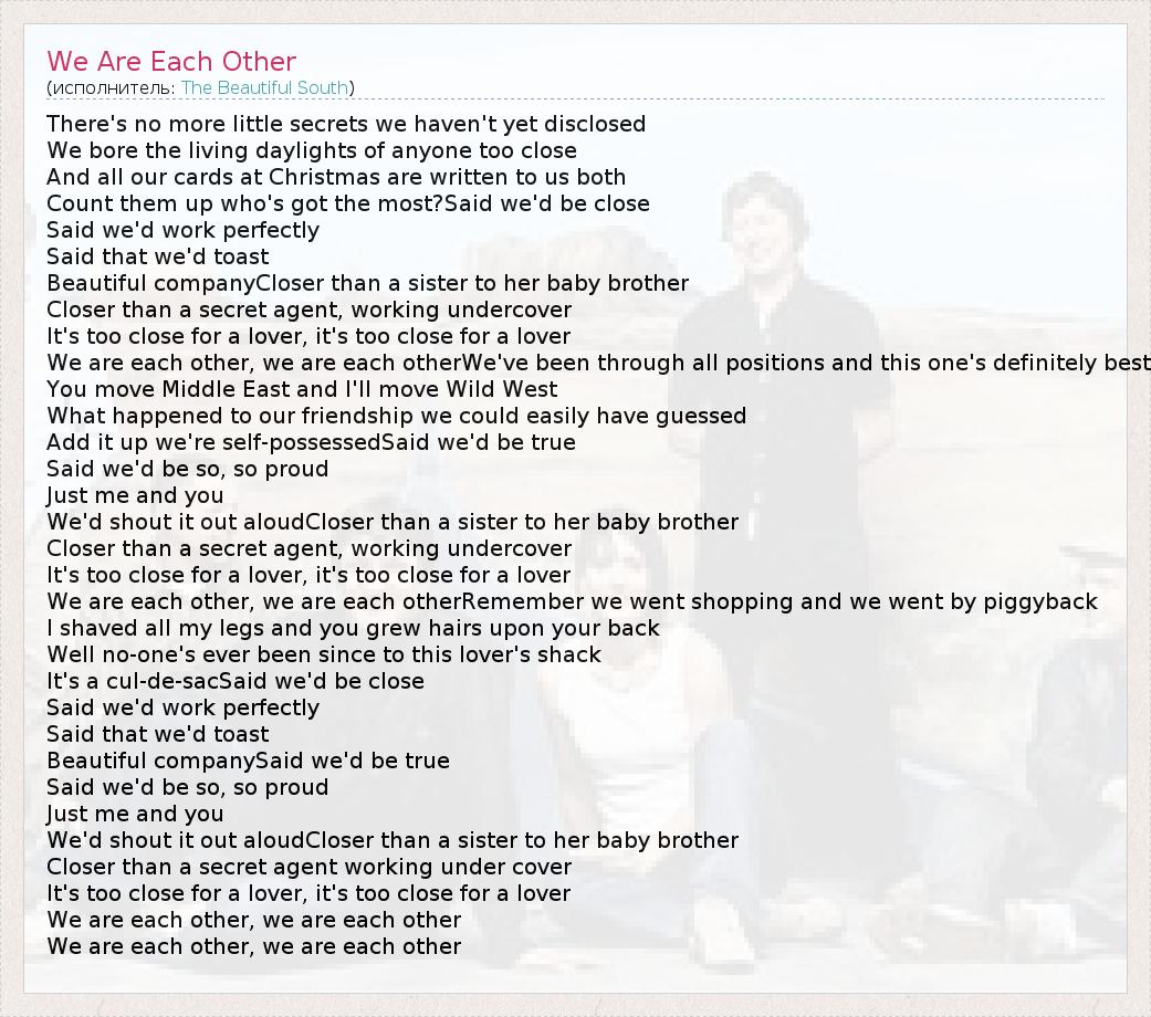 А как ты думаешь, о чем песня "We Are Each Other" ?