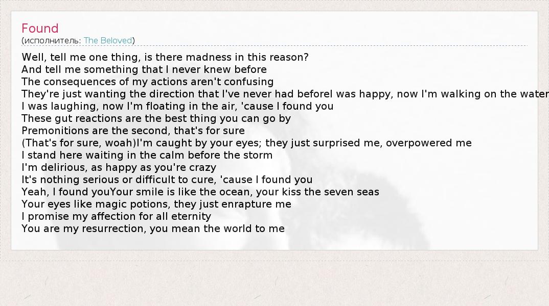 Well, tell me one thing, is there madness in this reason? And tell me something that I never knew before The consequences of my actions aren't confusing They're just wanting the direction that I've never had beforeI was happy, now I'm walking on the water I was laughing, now I'm floating in the air, 'cause I found you These gut reactions are the best thing you can go by Premonitions are the second, that's for sure (That's for sure, woah)I'm caught by your eyes; they just surprised me, overpowered me I stand here waiting in the calm before the storm I'm delirious, as happy as you're crazy It's nothing serious or difficult to cure, 'cause I found you Yeah, I found youYour smile is like the ocean, your kiss the seven seas Your eyes like magic potions, they just enrapture me I promise my affection for all eternity You are my resurrection, you mean the world to me