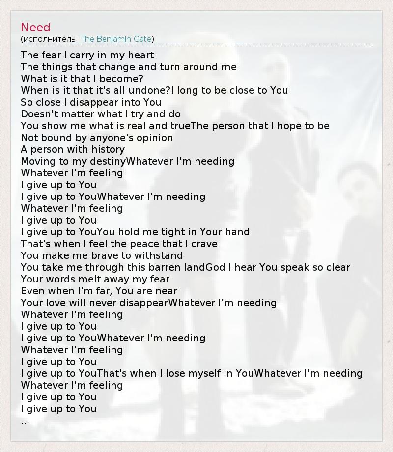 The fear I carry in my heart The things that change and turn around me What is it that I become? When is it that it's all undone?I long to be close to You So close I disappear into You Doesn't matter what I try and do You show me what is real and trueThe person that I hope to be Not bound by anyone's opinion A person with history Moving to my destinyWhatever I'm needing Whatever I'm feeling I give up to You I give up to YouWhatever I'm needing Whatever I'm feeling I give up to You I give up to YouYou hold me tight in Your hand That's when I feel the peace that I crave You make me brave to withstand You take me through this barren landGod I hear You speak so clear Your words melt away my fear Even when I'm far, You are near Your love will never disappearWhatever I'm needing Whatever I'm feeling I give up to You I give up to YouWhatever I'm needing Whatever I'm feeling I give up to You I give up to YouThat's when I lose myself in YouWhatever I'm needing Whatever I'm feeling I give up to You I give up to You ...