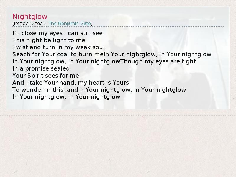 If I close my eyes I can still see This night be light to me Twist and turn in my weak soul Seach for Your coal to burn meIn Your nightglow, in Your nightglow In Your nightglow, in Your nightglowThough my eyes are tight In a promise sealed Your Spirit sees for me And I take Your hand, my heart is Yours To wonder in this landIn Your nightglow, in Your nightglow In Your nightglow, in Your nightglow