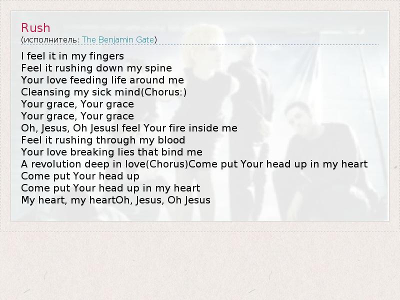 I feel it in my fingers Feel it rushing down my spine Your love feeding life around me Cleansing my sick mind(Chorus:) Your grace, Your grace Your grace, Your grace Oh, Jesus, Oh JesusI feel Your fire inside me Feel it rushing through my blood Your love breaking lies that bind me A revolution deep in love(Chorus)Come put Your head up in my heart Come put Your head up Come put Your head up in my heart My heart, my heartOh, Jesus, Oh Jesus