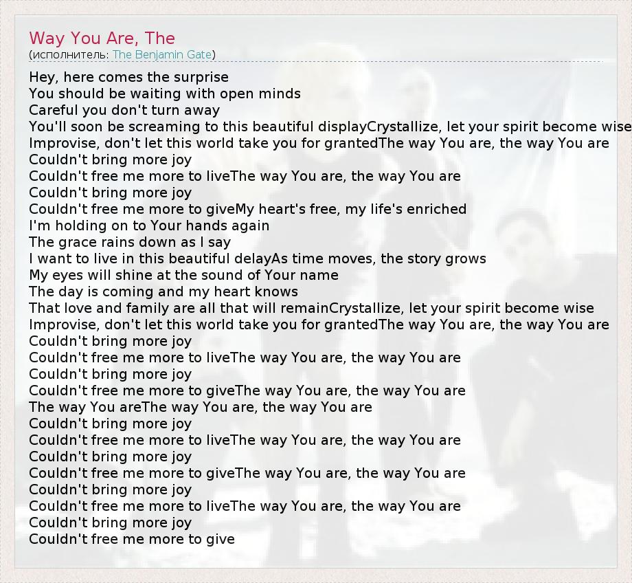 Hey, here comes the surprise You should be waiting with open minds Careful you don't turn away You'll soon be screaming to this beautiful displayCrystallize, let your spirit become wise Improvise, don't let this world take you for grantedThe way You are, the way You are Couldn't bring more joy Couldn't free me more to liveThe way You are, the way You are Couldn't bring more joy Couldn't free me more to giveMy heart's free, my life's enriched I'm holding on to Your hands again The grace rains down as I say I want to live in this beautiful delayAs time moves, the story grows My eyes will shine at the sound of Your name The day is coming and my heart knows That love and family are all that will remainCrystallize, let your spirit become wise Improvise, don't let this world take you for grantedThe way You are, the way You are Couldn't bring more joy Couldn't free me more to liveThe way You are, the way You are Couldn't bring more joy Couldn't free me more to giveThe way You are, the way You are The way You areThe way You are, the way You are Couldn't bring more joy Couldn't free me more to liveThe way You are, the way You are Couldn't bring more joy Couldn't free me more to giveThe way You are, the way You are Couldn't bring more joy Couldn't free me more to liveThe way You are, the way You are Couldn't bring more joy Couldn't free me more to give