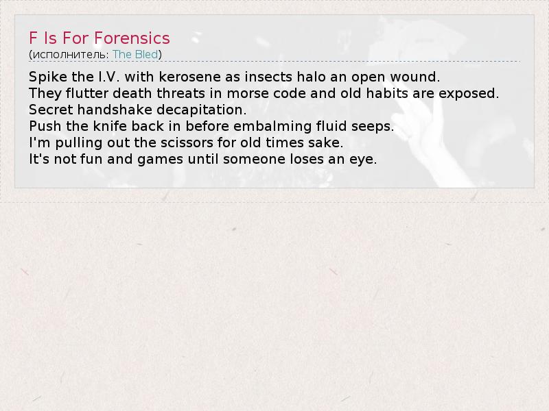 А как ты думаешь, о чем песня "F Is For Forensics" ?