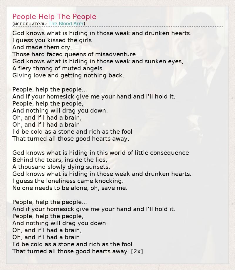 God knows what is hiding in those weak and drunken hearts. I guess you kissed the girls And made them cry, Those hard faced queens of misadventure. God knows what is hiding in those weak and sunken eyes, A fiery throng of muted angels Giving love and getting nothing back. People, help the people... And if your homesick give me your hand and I'll hold it. People, help the people, And nothing will drag you down. Oh, and if I had a brain, Oh, and if I had a brain I'd be cold as a stone and rich as the fool That turned all those good hearts away. God knows what is hiding in this world of little consequence Behind the tears, inside the lies, A thousand slowly dying sunsets. God knows what is hiding in those weak and drunken hearts. I guess the loneliness came knocking. No one needs to be alone, oh, save me. People, help the people... And if your homesick give me your hand and I'll hold it. People, help the people, And nothing will drag you down. Oh, and if I had a brain, Oh, and if I had a brain I'd be cold as a stone and rich as the fool That turned all those good hearts away. [2x]