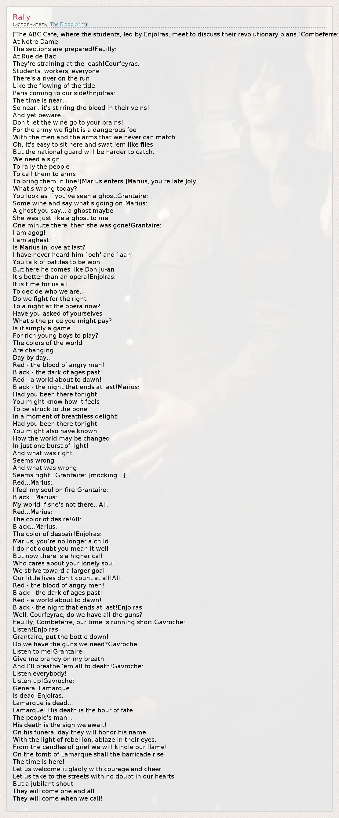 [The ABC Cafe, where the students, led by Enjolras, meet to discuss their revolutionary plans.]Combeferre: At Notre Dame The sections are prepared!Feuilly: At Rue de Bac They're straining at the leash!Courfeyrac: Students, workers, everyone There's a river on the run Like the flowing of the tide Paris coming to our side!Enjolras: The time is near... So near.. it's stirring the blood in their veins! And yet beware... Don't let the wine go to your brains! For the army we fight is a dangerous foe With the men and the arms that we never can match Oh, it's easy to sit here and swat 'em like flies But the national guard will be harder to catch. We need a sign To rally the people To call them to arms To bring them in line![Marius enters.]Marius, you're late.Joly: What's wrong today? You look as if you've seen a ghost.Grantaire: Some wine and say what's going on!Marius: A ghost you say... a ghost maybe She was just like a ghost to me One minute there, then she was gone!Grantaire: I am agog! I am aghast! Is Marius in love at last? I have never heard him `ooh' and `aah' You talk of battles to be won But here he comes like Don Ju-an It's better than an opera!Enjolras: It is time for us all To decide who we are... Do we fight for the right To a night at the opera now? Have you asked of yourselves What's the price you might pay? Is it simply a game For rich young boys to play? The colors of the world Are changing Day by day... Red - the blood of angry men! Black - the dark of ages past! Red - a world about to dawn! Black - the night that ends at last!Marius: Had you been there tonight You might know how it feels To be struck to the bone In a moment of breathless delight! Had you been there tonight You might also have known How the world may be changed In just one burst of light! And what was right Seems wrong And what was wrong Seems right...Grantaire: [mocking...] Red...Marius: I feel my soul on fire!Grantaire: Black...Marius: My world if she's not there...All: Red...Marius: The color of desire!All: Black...Marius: The color of despair!Enjolras: Marius, you're no longer a child I do not doubt you mean it well But now there is a higher call Who cares about your lonely soul We strive toward a larger goal Our little lives don't count at all!All: Red - the blood of angry men! Black - the dark of ages past! Red - a world about to dawn! Black - the night that ends at last!Enjolras: Well, Courfeyrac, do we have all the guns? Feuilly, Combeferre, our time is running short.Gavroche: Listen!Enjolras: Grantaire, put the bottle down! Do we have the guns we need?Gavroche: Listen to me!Grantaire: Give me brandy on my breath And I'll breathe 'em all to death!Gavroche: Listen everybody! Listen up!Gavroche: General Lamarque Is dead!Enjolras: Lamarque is dead... Lamarque! His death is the hour of fate. The people's man... His death is the sign we await! On his funeral day they will honor his name. With the light of rebellion, ablaze in their eyes. From the candles of grief we will kindle our flame! On the tomb of Lamarque shall the barricade rise! The time is here! Let us welcome it gladly with courage and cheer Let us take to the streets with no doubt in our hearts But a jubilant shout They will come one and all They will come when we call!