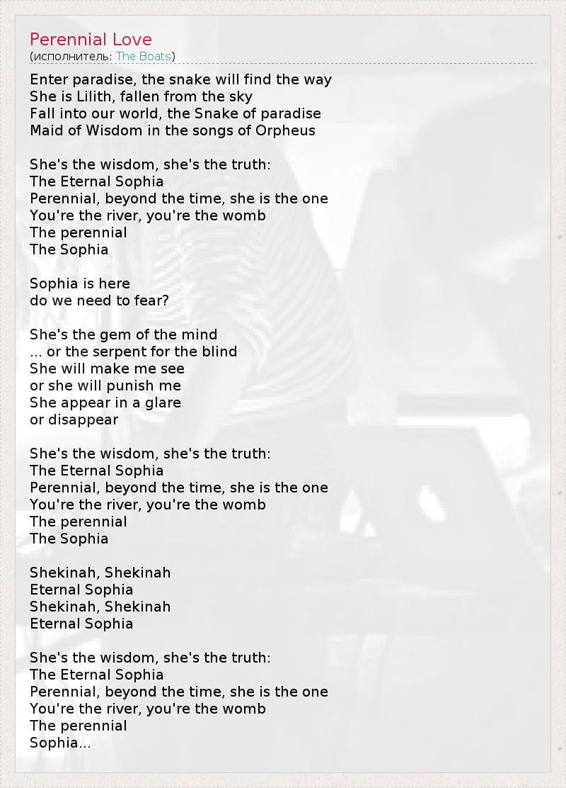 Змея, найди путь в рай и войди в него, Она – Лилит 2, падшая с небес. Падшая в наш мир, райская Змея, Дева Мудрости, воспетая Орфеем. Она – мудрость, она – истина: Вечная София. Неизменная, вне времени, единственная, Ты – река, ты – исток... Неувядающая София. София здесь, Следует ли нам бояться? Она – драгоценный камень сознания ...или же искушение для слепцов. Она дарует мне озарение Или же покарает. Она в сиянии прибывает Или же исчезает. Она – мудрость, она – истина: Вечная София. Неизменная, вне времени, единственная, Ты – река, ты – исток... Неувядающая София. Шекина 3, Шекина, Вечная София, Шекина, Шекина, Вечная София... Она – мудрость, она – истина: Вечная София. Неизменная, вне времени, единственная, Ты – река, ты – исток... Неувядающая София. 1 - София – в иудаистических и христианских религиозно-мифологических представлениях олицетворённая мудрость. 2 – Лилит – первая жена Адама в еврейской мифологии. Согласно преданию, расставшись с Адамом, Лилит стала злым демоном. 3 – Шекина – в иудейских традициях обожествлённое женское начало.
