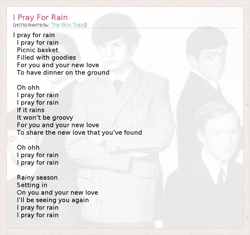 I pray for rain I pray for rain Picnic basket Filled with goodies For you and your new love To have dinner on the ground Oh ohh I pray for rain I pray for rain If it rains It won't be groovy For you and your new love To share the new love that you've found Oh ohh I pray for rain I pray for rain Rainy season Setting in On you and your new love I'll be seeing you again I pray for rain I pray for rain