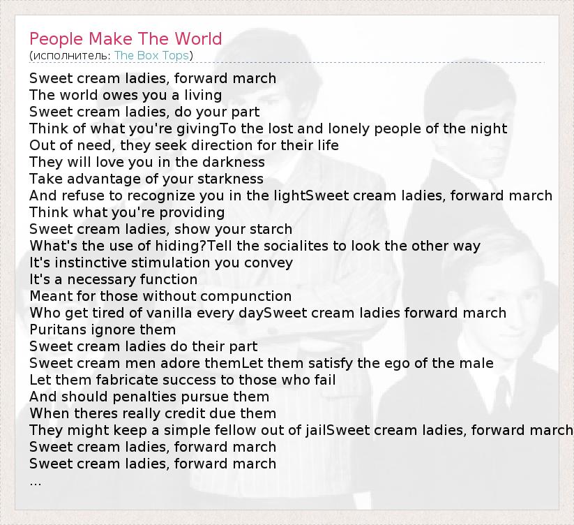 Это интересно:За свою недолгую карьеру "Box tops" заработали себе славу одной из лучших "белых" соул-групп, несмотря на то, что они были не столь плодовитыми, как, скажем, "Righteous Brothers" или "Rascals". История команды началась в Мемфисе (штат Теннеси), где под вывеской "The Devilles" собрались четверо школьных приятелей – Билл Каннингхэм (р. 23 января 1950), Джон Эванс (р. 18 июня 1948), Дэнни Смит (р. 25 августа... продолжение
