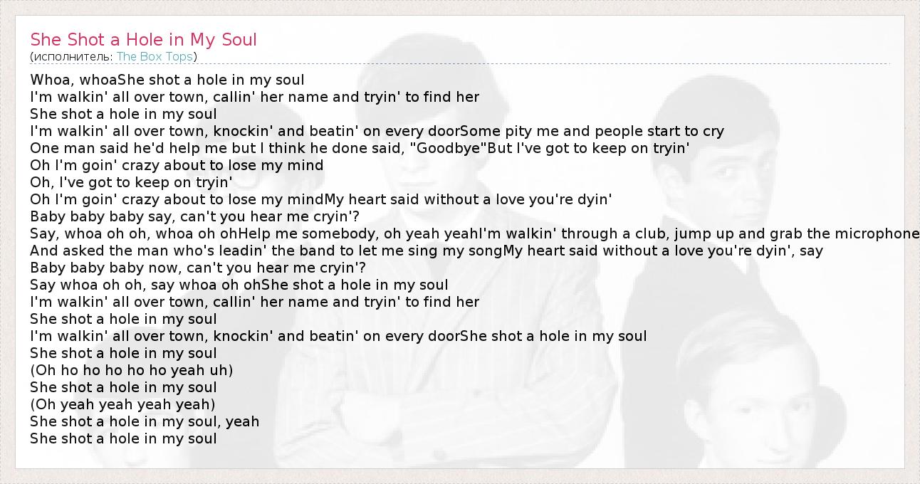 ГлавнаяИсполнителиThe Box TopsShe Shot a Hole in My Soul