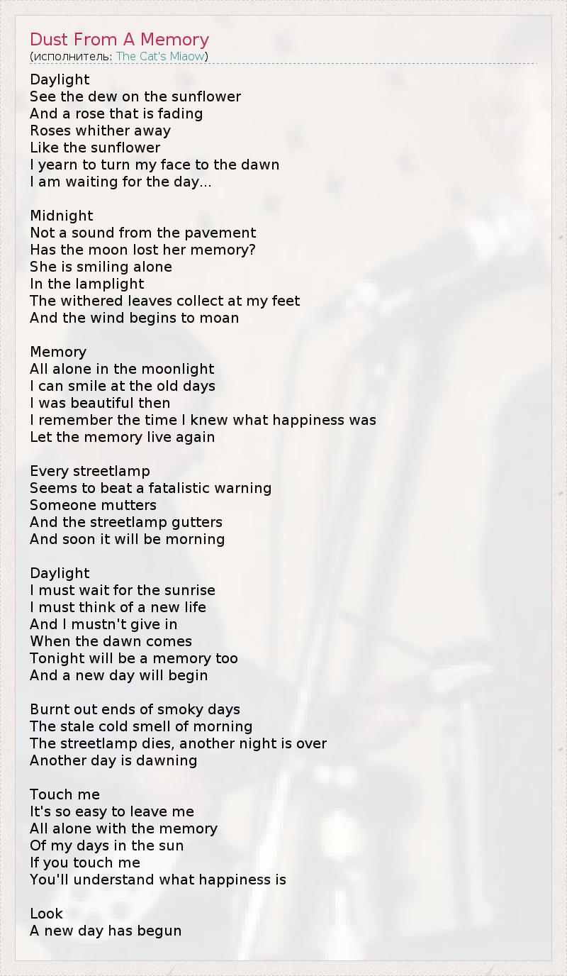 Daylight See the dew on the sunflower And a rose that is fading Roses whither away Like the sunflower I yearn to turn my face to the dawn I am waiting for the day... Midnight Not a sound from the pavement Has the moon lost her memory? She is smiling alone In the lamplight The withered leaves collect at my feet And the wind begins to moan Memory All alone in the moonlight I can smile at the old days I was beautiful then I remember the time I knew what happiness was Let the memory live again Every streetlamp Seems to beat a fatalistic warning Someone mutters And the streetlamp gutters And soon it will be morning Daylight I must wait for the sunrise I must think of a new life And I mustn't give in When the dawn comes Tonight will be a memory too And a new day will begin Burnt out ends of smoky days The stale cold smell of morning The streetlamp dies, another night is over Another day is dawning Touch me It's so easy to leave me All alone with the memory Of my days in the sun If you touch me You'll understand what happiness is Look A new day has begun