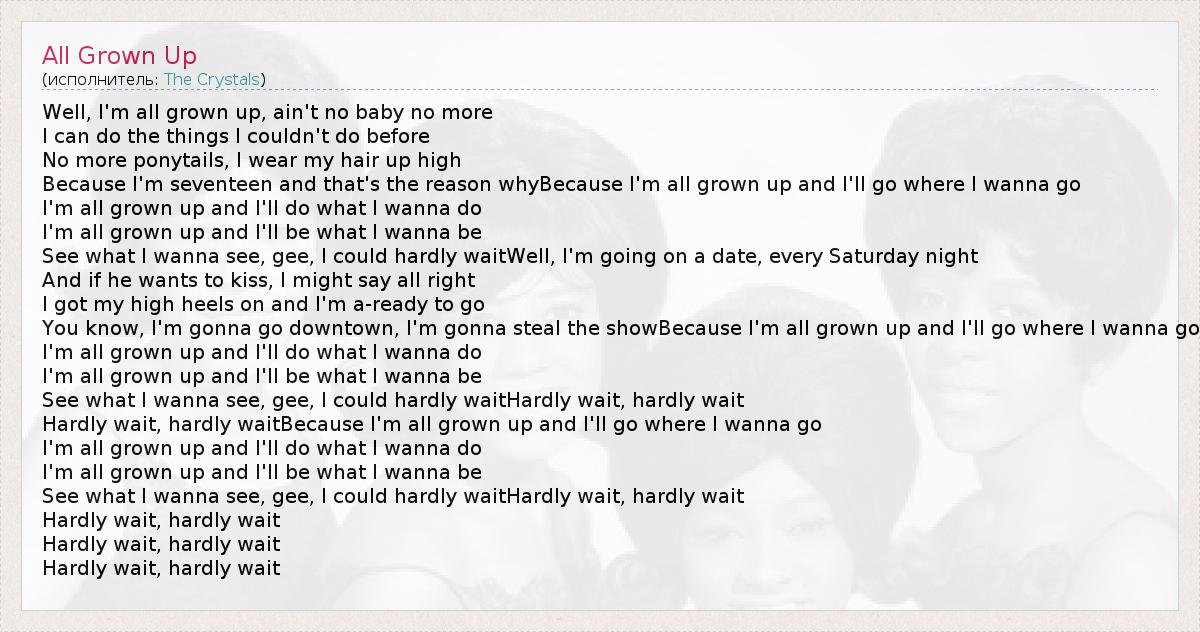 Well, I'm all grown up, ain't no baby no more I can do the things I couldn't do before No more ponytails, I wear my hair up high Because I'm seventeen and that's the reason whyBecause I'm all grown up and I'll go where I wanna go I'm all grown up and I'll do what I wanna do I'm all grown up and I'll be what I wanna be See what I wanna see, gee, I could hardly waitWell, I'm going on a date, every Saturday night And if he wants to kiss, I might say all right I got my high heels on and I'm a-ready to go You know, I'm gonna go downtown, I'm gonna steal the showBecause I'm all grown up and I'll go where I wanna go I'm all grown up and I'll do what I wanna do I'm all grown up and I'll be what I wanna be See what I wanna see, gee, I could hardly waitHardly wait, hardly wait Hardly wait, hardly waitBecause I'm all grown up and I'll go where I wanna go I'm all grown up and I'll do what I wanna do I'm all grown up and I'll be what I wanna be See what I wanna see, gee, I could hardly waitHardly wait, hardly wait Hardly wait, hardly wait Hardly wait, hardly wait Hardly wait, hardly wait