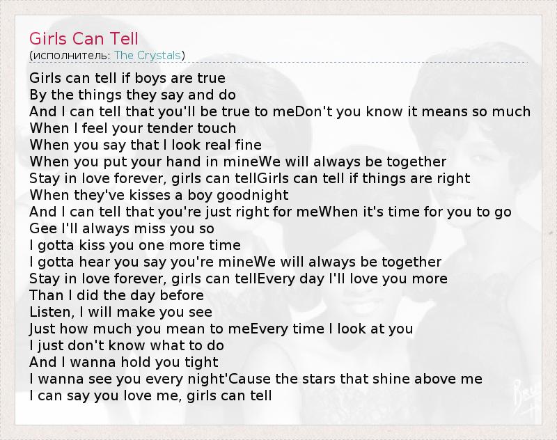 Girls can tell if boys are true By the things they say and do And I can tell that you'll be true to meDon't you know it means so much When I feel your tender touch When you say that I look real fine When you put your hand in mineWe will always be together Stay in love forever, girls can tellGirls can tell if things are right When they've kisses a boy goodnight And I can tell that you're just right for meWhen it's time for you to go Gee I'll always miss you so I gotta kiss you one more time I gotta hear you say you're mineWe will always be together Stay in love forever, girls can tellEvery day I'll love you more Than I did the day before Listen, I will make you see Just how much you mean to meEvery time I look at you I just don't know what to do And I wanna hold you tight I wanna see you every night'Cause the stars that shine above me I can say you love me, girls can tell