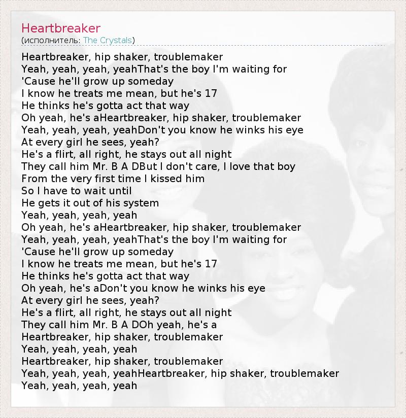 Heartbreaker, hip shaker, troublemaker Yeah, yeah, yeah, yeahThat's the boy I'm waiting for 'Cause he'll grow up someday I know he treats me mean, but he's 17 He thinks he's gotta act that way Oh yeah, he's aHeartbreaker, hip shaker, troublemaker Yeah, yeah, yeah, yeahDon't you know he winks his eye At every girl he sees, yeah? He's a flirt, all right, he stays out all night They call him Mr. B A DBut I don't care, I love that boy From the very first time I kissed him So I have to wait until He gets it out of his system Yeah, yeah, yeah, yeah Oh yeah, he's aHeartbreaker, hip shaker, troublemaker Yeah, yeah, yeah, yeahThat's the boy I'm waiting for 'Cause he'll grow up someday I know he treats me mean, but he's 17 He thinks he's gotta act that way Oh yeah, he's aDon't you know he winks his eye At every girl he sees, yeah? He's a flirt, all right, he stays out all night They call him Mr. B A DOh yeah, he's a Heartbreaker, hip shaker, troublemaker Yeah, yeah, yeah, yeah Heartbreaker, hip shaker, troublemaker Yeah, yeah, yeah, yeahHeartbreaker, hip shaker, troublemaker Yeah, yeah, yeah, yeah
