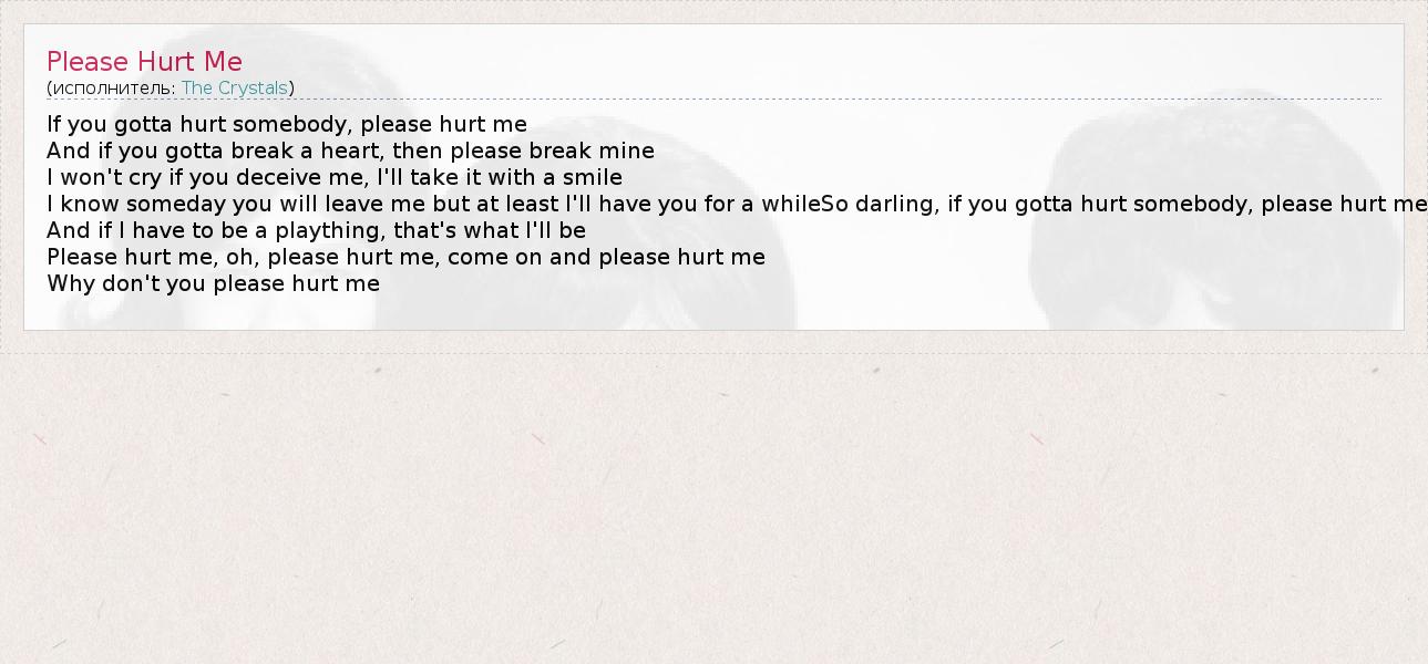 If you gotta hurt somebody, please hurt me And if you gotta break a heart, then please break mine I won't cry if you deceive me, I'll take it with a smile I know someday you will leave me but at least I'll have you for a whileSo darling, if you gotta hurt somebody, please hurt me And if I have to be a plaything, that's what I'll be Please hurt me, oh, please hurt me, come on and please hurt me Why don't you please hurt me