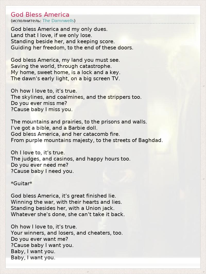 God bless America and my only dues. Land that I love, if we only lose. Standing beside her, and keeping score. Guiding her freedom, to the end of these doors. God bless America, my land you must see. Saving the world, through catastrophe. My home, sweet home, is a lock and a key. The dawn's early light, on a big screen TV. Oh how I love to, it's true. The skylines, and coalmines, and the strippers too. Do you ever miss me? ?Cause baby I miss you. The mountains and prairies, to the prisons and walls. I've got a bible, and a Barbie doll. God bless America, and her catacomb fire. From purple mountains majesty, to the streets of Baghdad. Oh I love to, it's true. The judges, and casinos, and happy hours too. Do you ever need me? ?Cause baby I need you. *Guitar* God bless America, it's great finished lie. Winning the war, with their hearts and lies. Standing besides her, with a Union jack. Whatever she's done, she can't take it back. Oh how I love to, it's true. Your winners, and losers, and cheaters, too. Do you ever want me? ?Cause baby I want you. Baby, I want you. Baby, I want you.