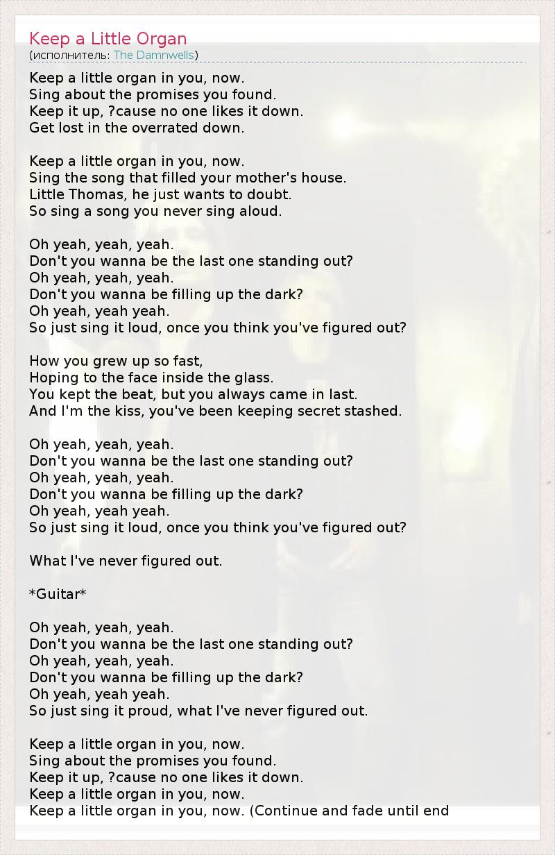 Keep a little organ in you, now. Sing about the promises you found. Keep it up, ?cause no one likes it down. Get lost in the overrated down. Keep a little organ in you, now. Sing the song that filled your mother's house. Little Thomas, he just wants to doubt. So sing a song you never sing aloud. Oh yeah, yeah, yeah. Don't you wanna be the last one standing out? Oh yeah, yeah, yeah. Don't you wanna be filling up the dark? Oh yeah, yeah yeah. So just sing it loud, once you think you've figured out? How you grew up so fast, Hoping to the face inside the glass. You kept the beat, but you always came in last. And I'm the kiss, you've been keeping secret stashed. Oh yeah, yeah, yeah. Don't you wanna be the last one standing out? Oh yeah, yeah, yeah. Don't you wanna be filling up the dark? Oh yeah, yeah yeah. So just sing it loud, once you think you've figured out? What I've never figured out. *Guitar* Oh yeah, yeah, yeah. Don't you wanna be the last one standing out? Oh yeah, yeah, yeah. Don't you wanna be filling up the dark? Oh yeah, yeah yeah. So just sing it proud, what I've never figured out. Keep a little organ in you, now. Sing about the promises you found. Keep it up, ?cause no one likes it down. Keep a little organ in you, now. Keep a little organ in you, now. (Continue and fade until end