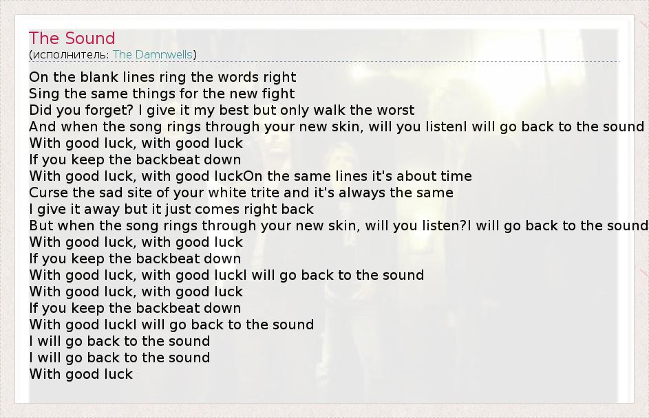 On the blank lines ring the words right Sing the same things for the new fight Did you forget? I give it my best but only walk the worst And when the song rings through your new skin, will you listenI will go back to the sound With good luck, with good luck If you keep the backbeat down With good luck, with good luckOn the same lines it's about time Curse the sad site of your white trite and it's always the same I give it away but it just comes right back But when the song rings through your new skin, will you listen?I will go back to the sound With good luck, with good luck If you keep the backbeat down With good luck, with good luckI will go back to the sound With good luck, with good luck If you keep the backbeat down With good luckI will go back to the sound I will go back to the sound I will go back to the sound With good luck
