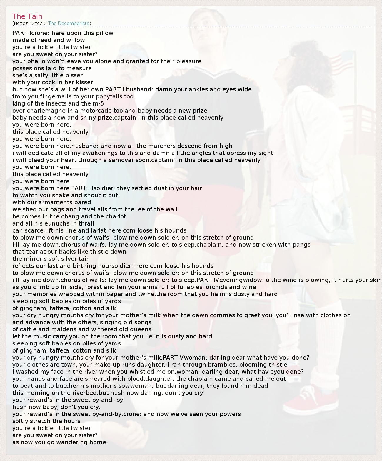 Это интересно:Главный поэт-песенник и лидер группы The Decemberists Колин Мелой (Colin Meloy) родом из славного города Портленда. Когда-то в середине 90-х он еще играл alt-country в захудалой группе Tarkio. Группа, так и не отведав славы распалась, после того, как два их прекрасно сделанных альбома не окупили себя и, можно сказать, провалились. Но ничего, это было только начало.Долгие творческие поиски в итоге вылились в... продолжение