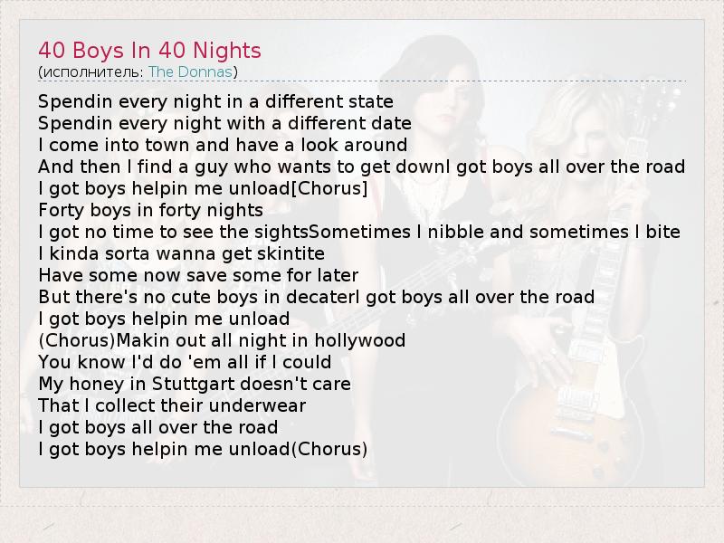 А как ты думаешь, о чем песня "40 Boys In 40 Nights" ?