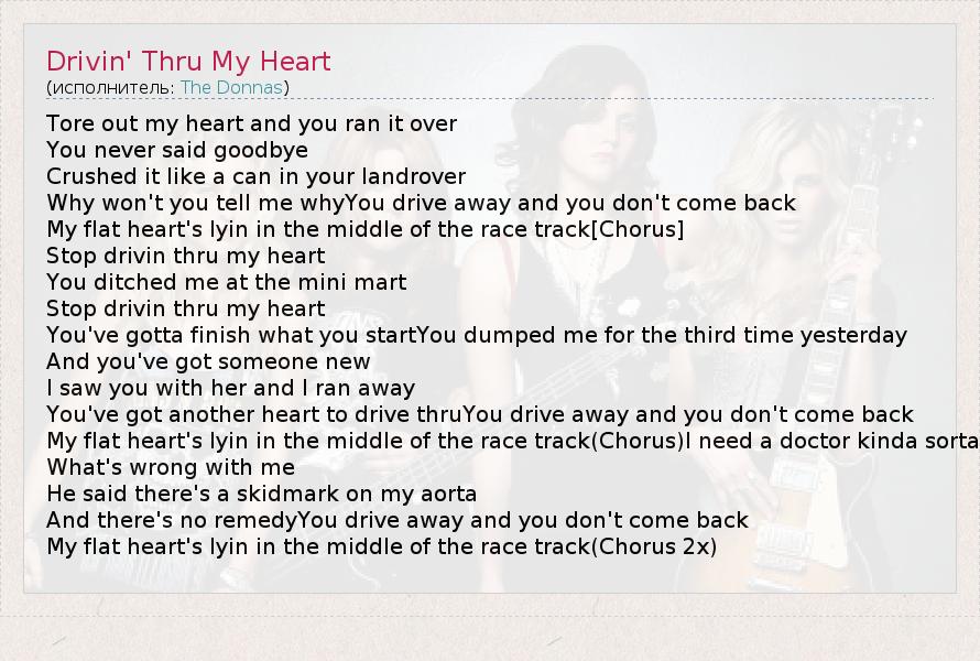 А как ты думаешь, о чем песня "Drivin' Thru My Heart" ?