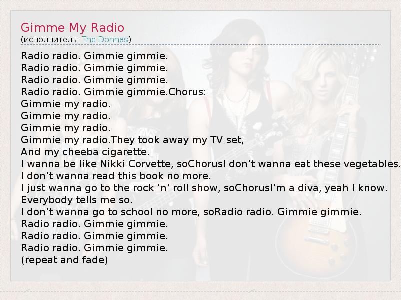 Radio radio. Gimmie gimmie.Chorus: