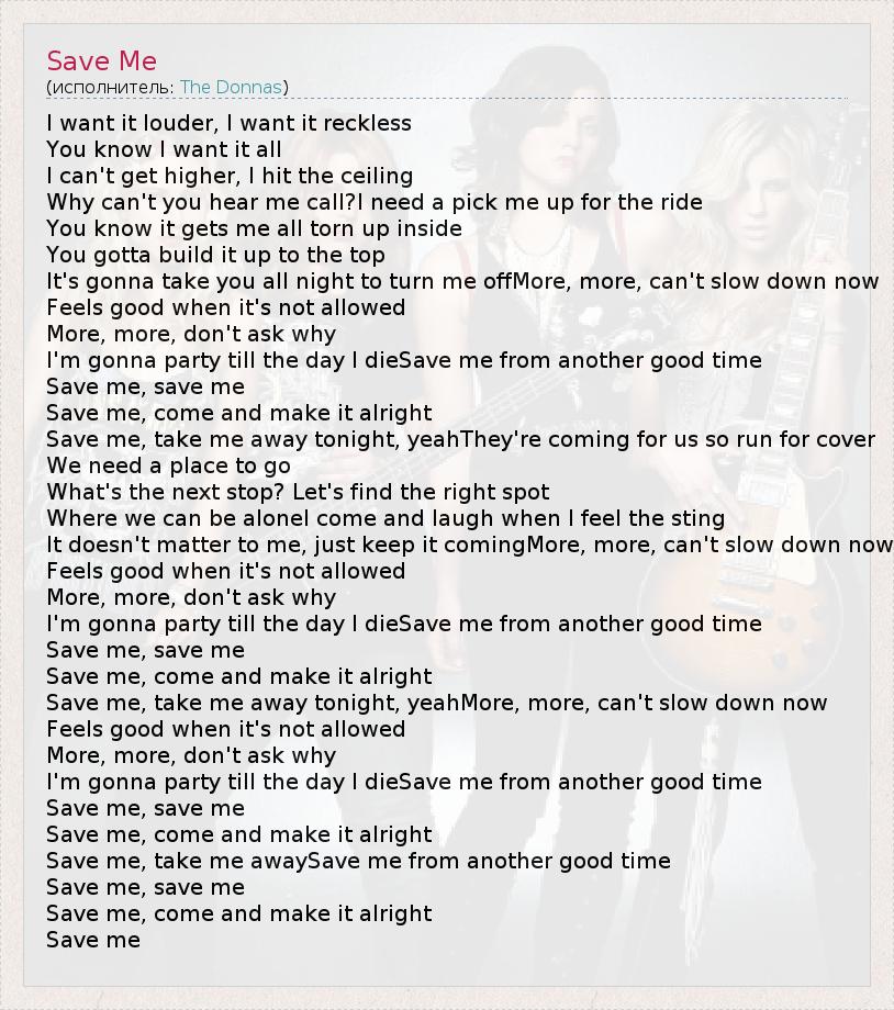 I want it louder, I want it reckless You know I want it all I can't get higher, I hit the ceiling Why can't you hear me call?I need a pick me up for the ride You know it gets me all torn up inside You gotta build it up to the top It's gonna take you all night to turn me offMore, more, can't slow down now Feels good when it's not allowed More, more, don't ask why I'm gonna party till the day I dieSave me from another good time Save me, save me Save me, come and make it alright Save me, take me away tonight, yeahThey're coming for us so run for cover We need a place to go What's the next stop? Let's find the right spot Where we can be aloneI come and laugh when I feel the sting It doesn't matter to me, just keep it comingMore, more, can't slow down now Feels good when it's not allowed More, more, don't ask why I'm gonna party till the day I dieSave me from another good time Save me, save me Save me, come and make it alright Save me, take me away tonight, yeahMore, more, can't slow down now Feels good when it's not allowed More, more, don't ask why I'm gonna party till the day I dieSave me from another good time Save me, save me Save me, come and make it alright Save me, take me awaySave me from another good time Save me, save me Save me, come and make it alright Save me