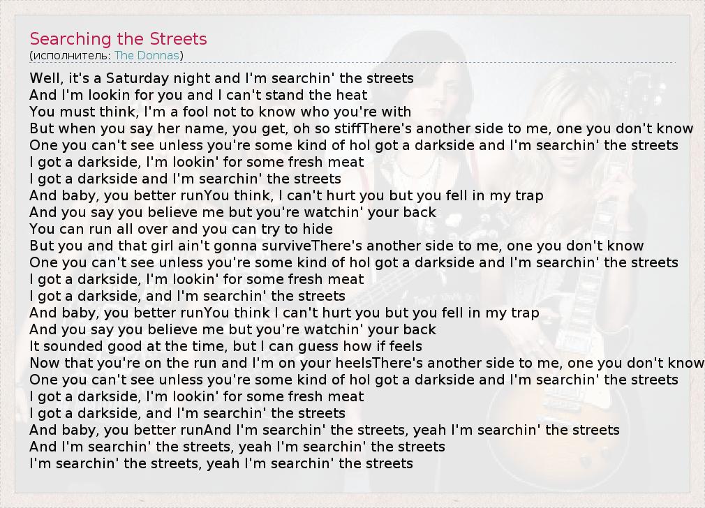 And I'm searchin' the streets, yeah I'm searchin' the streets