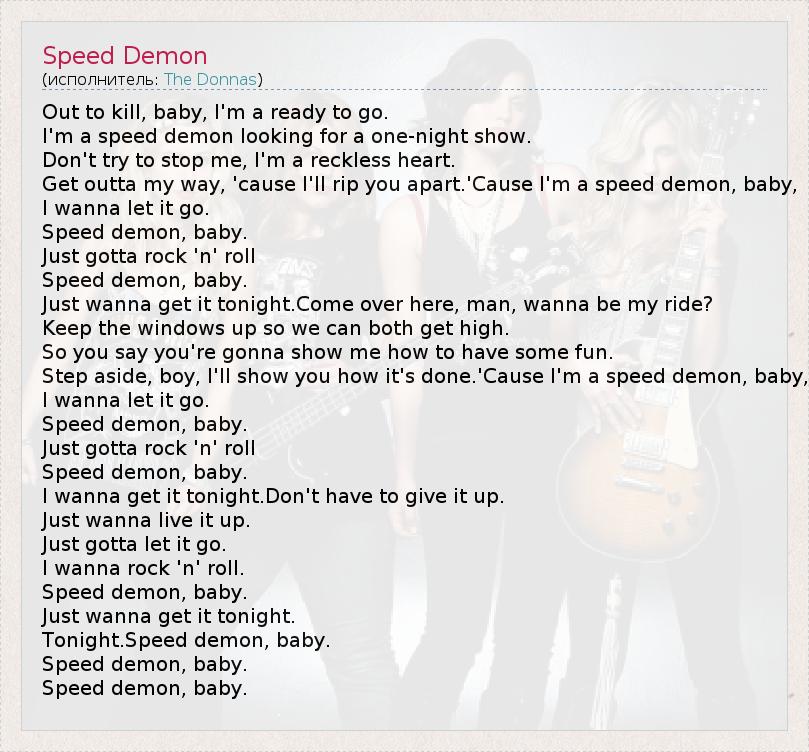 Out to kill, baby, I'm a ready to go. I'm a speed demon looking for a one-night show. Don't try to stop me, I'm a reckless heart. Get outta my way, 'cause I'll rip you apart.'Cause I'm a speed demon, baby, I wanna let it go. Speed demon, baby. Just gotta rock 'n' roll Speed demon, baby. Just wanna get it tonight.Come over here, man, wanna be my ride? Keep the windows up so we can both get high. So you say you're gonna show me how to have some fun. Step aside, boy, I'll show you how it's done.'Cause I'm a speed demon, baby, I wanna let it go. Speed demon, baby. Just gotta rock 'n' roll Speed demon, baby. I wanna get it tonight.Don't have to give it up. Just wanna live it up. Just gotta let it go. I wanna rock 'n' roll. Speed demon, baby. Just wanna get it tonight. Tonight.Speed demon, baby. Speed demon, baby. Speed demon, baby.