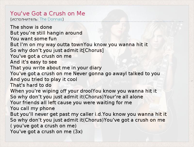 The show is done But you're still hangin around You want some fun But I'm on my way outta townYou know you wanna hit it So why don't you just admit it[Chorus] You've got a crush on me And it's easy to see That you write about me in your diary You've got a crush on me Never gonna go awayI talked to you And you tried to play it cool That's hard to do When you're wiping off your droolYou know you wanna hit it So why don't you just admit it(Chorus)Your're all alone Your friends all left cause you were waiting for me You call my phone But you'll never get past my caller i.d.You know you wanna hit it So why don't you just admit it(Chorus)You've got a crush on me ( you've got a crush on me) You've got a crush on me (3x)
