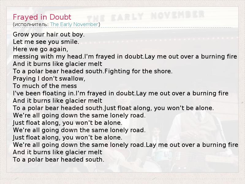 А как ты думаешь, о чем песня "Frayed in Doubt" ?