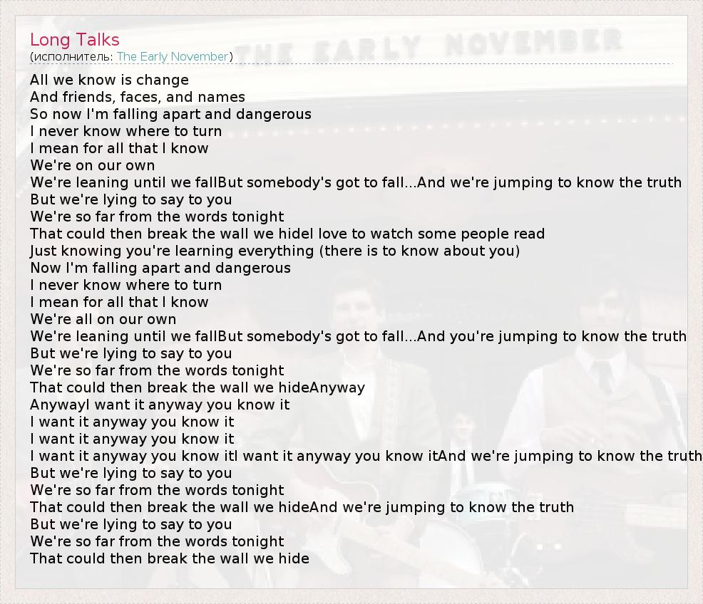 Это интересно:The Early November собрались городе Хаммонтон, штат Нью-Джерси, США, где Ace Enders, барабанщик Jeff Krummer и басист Sergio Anello впервые попробывали играть вместе. Позже к ним присоединился гитарист Joe Marro. После того, как ребята отослали своё демо в Drive Thru Records, им тут же предложили контракт. В пределах нескольких месяцев их EP For All Of This был записан в оригинальной и акустической версии. В то же время аудитория по... продолжение