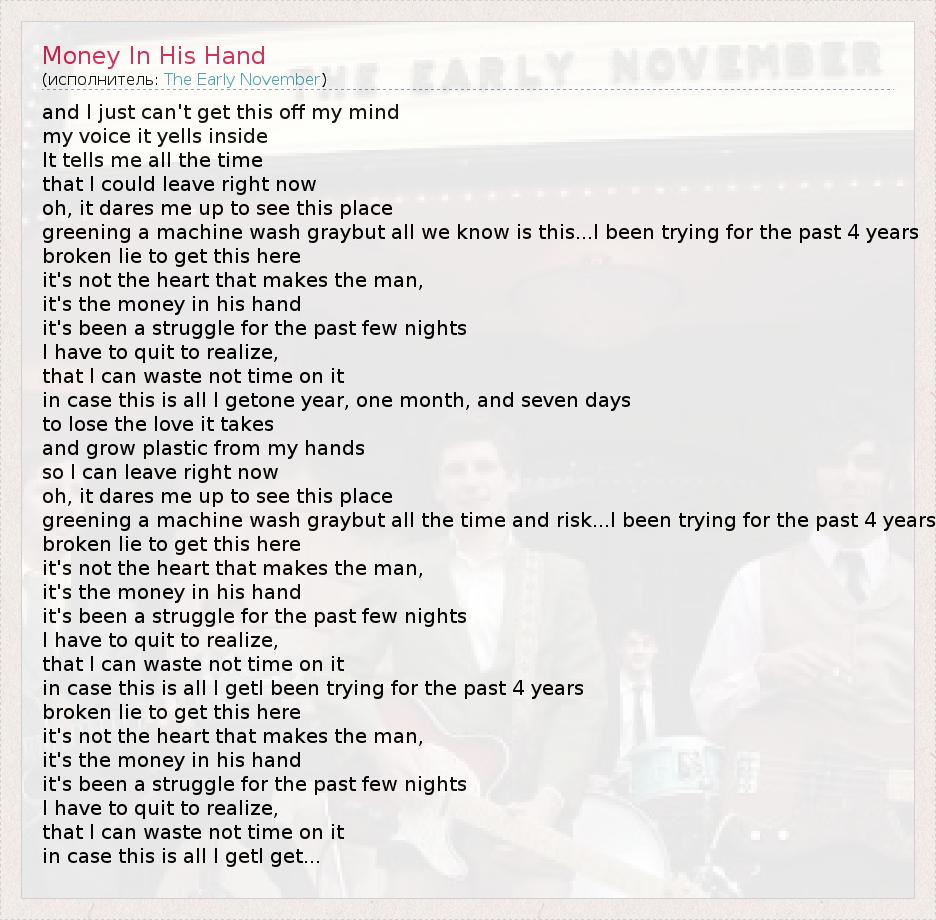 А как ты думаешь, о чем песня "Money In His Hand" ?
