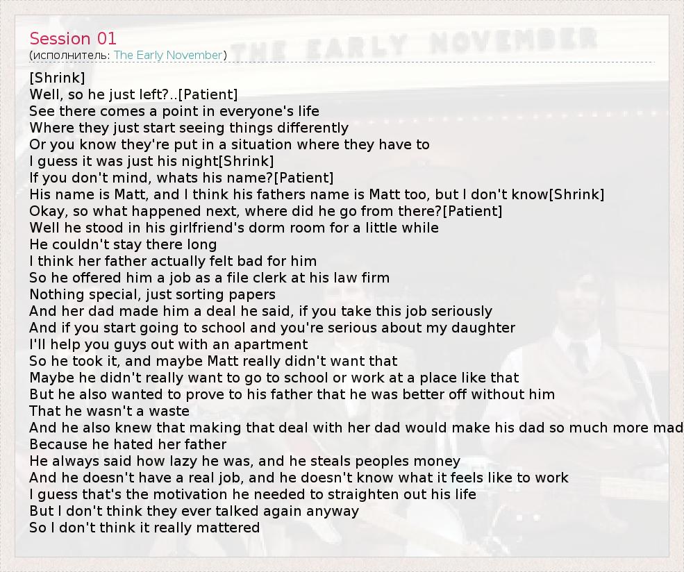 Это интересно:The Early November собрались городе Хаммонтон, штат Нью-Джерси, США, где Ace Enders, барабанщик Jeff Krummer и басист Sergio Anello впервые попробывали играть вместе. Позже к ним присоединился гитарист Joe Marro. После того, как ребята отослали своё демо в Drive Thru Records, им тут же предложили контракт. В пределах нескольких месяцев их EP For All Of This был записан в оригинальной и акустической версии. В то же время аудитория по... продолжение