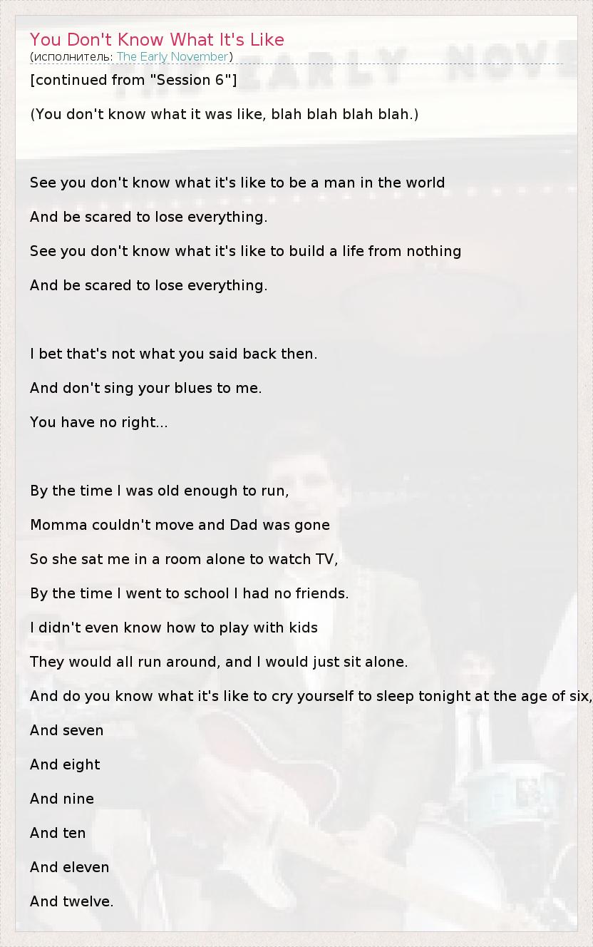 А как ты думаешь, о чем песня "You Don't Know What It's Like" ?