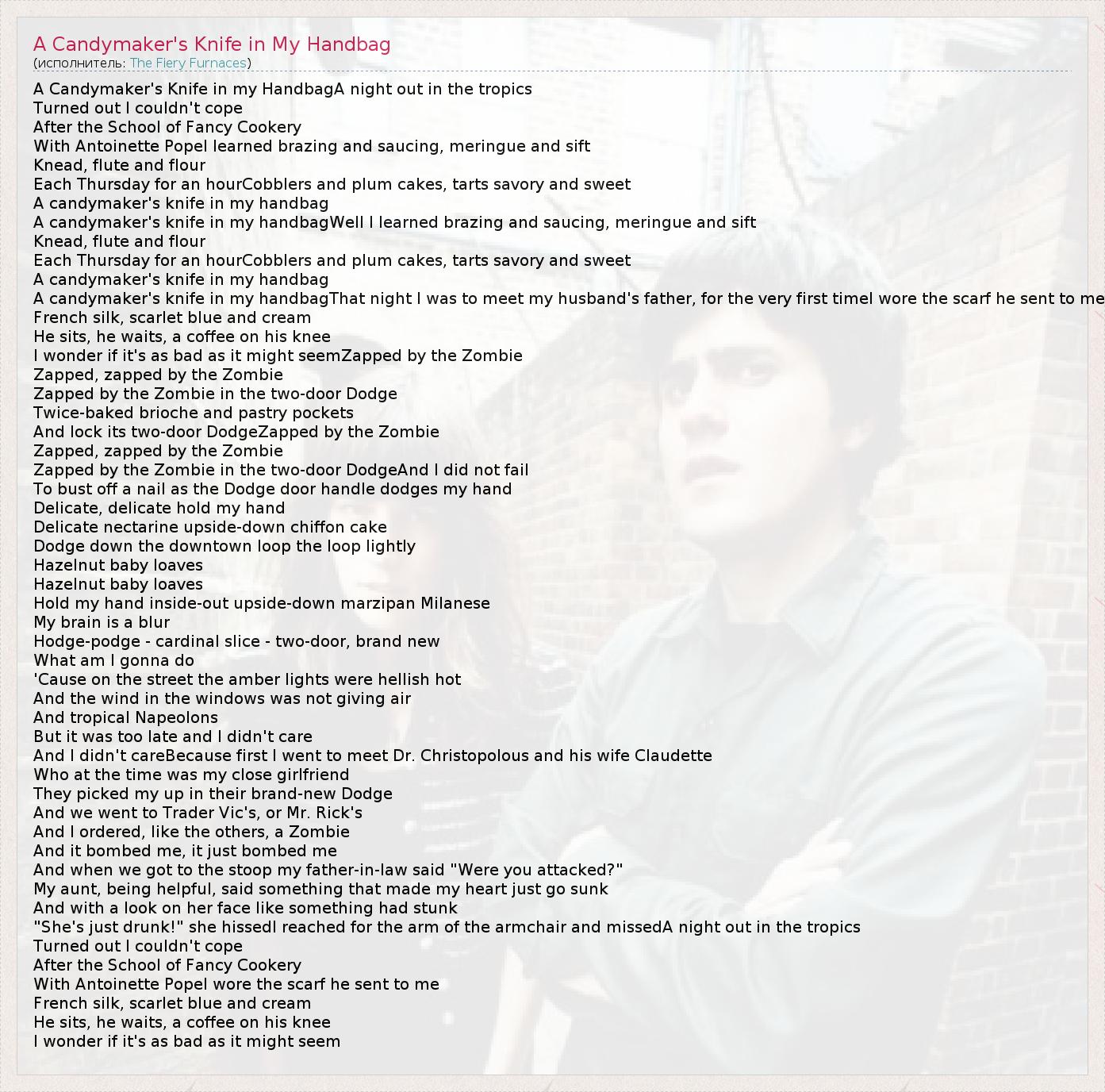 А как ты думаешь, о чем песня "A Candymaker's Knife in My Handbag" ?