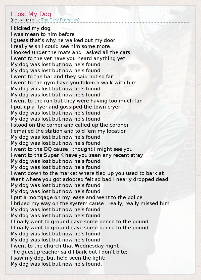 I kicked my dog I was mean to him before I guess that's why he walked out my door. I really wish I could see him some more. I looked under the mats and I asked all the cats I went to the vet have you heard anything yet My dog was lost but now he's found My dog was lost but now he's found I went to the bar and they said not so far I went to the gym have you taken a walk with him My dog was lost but now he's found My dog was lost but now he's found I went to the run but they were having too much fun I put up a flyer and gossiped the town cryer My dog was lost but now he's found My dog was lost but now he's found I stood on the corner and called up the coroner I emailed the station and told 'em my location My dog was lost but now he's found My dog was lost but now he's found I went to the DQ cause I thought I might see you I went to the Super K have you seen any recent stray My dog was lost but now he's found My dog was lost but now he's found I went down to the market where tied up you used to bark at Went where you got adopted felt so bad I nearly dropped dead My dog was lost but now he's found My dog was lost but now he's found I put a mortgage on my lease and went to the police I bribed my way on the system cause I really, really missed him My dog was lost but now he's found My dog was lost but now he's found I finally went to ground gave some pence to the pound I finally went to ground gave some pence to the pound My dog was lost but now he's found My dog was lost but now he's found I went to the church that Wednesday night The guest preacher said I bark but I don't bite; I saw my dog, but he'd seen the light: My dog was lost but now he's found.