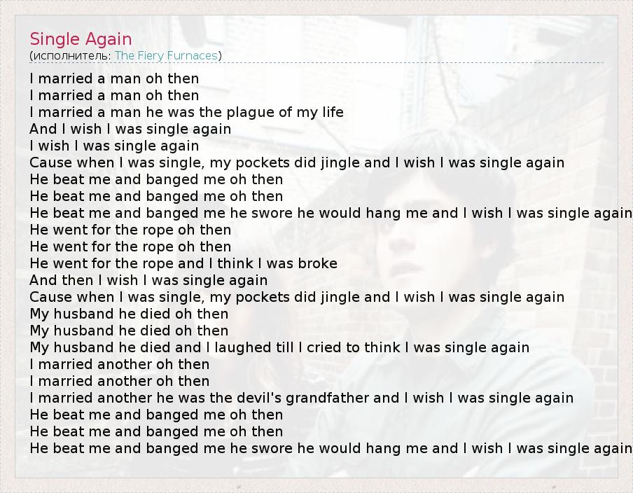I married a man oh then I married a man oh then I married a man he was the plague of my life And I wish I was single again I wish I was single again Cause when I was single, my pockets did jingle and I wish I was single again He beat me and banged me oh then He beat me and banged me oh then He beat me and banged me he swore he would hang me and I wish I was single again He went for the rope oh then He went for the rope oh then He went for the rope and I think I was broke And then I wish I was single again Cause when I was single, my pockets did jingle and I wish I was single again My husband he died oh then My husband he died oh then My husband he died and I laughed till I cried to think I was single again I married another oh then I married another oh then I married another he was the devil's grandfather and I wish I was single again He beat me and banged me oh then He beat me and banged me oh then He beat me and banged me he swore he would hang me and I wish I was single again