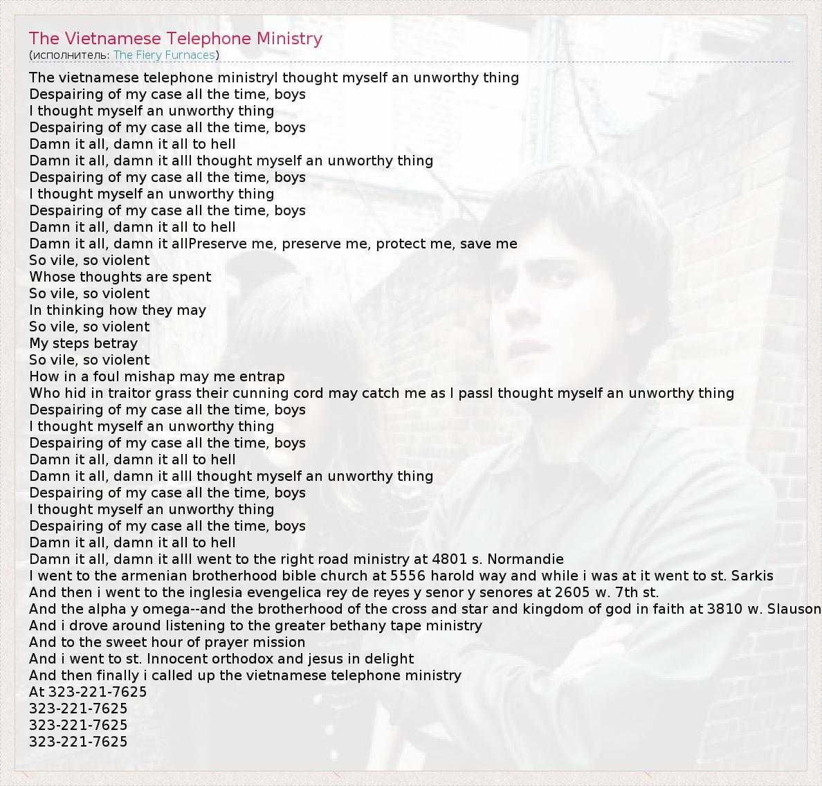 ГлавнаяИсполнителиThe Fiery FurnacesThe Vietnamese Telephone Ministry