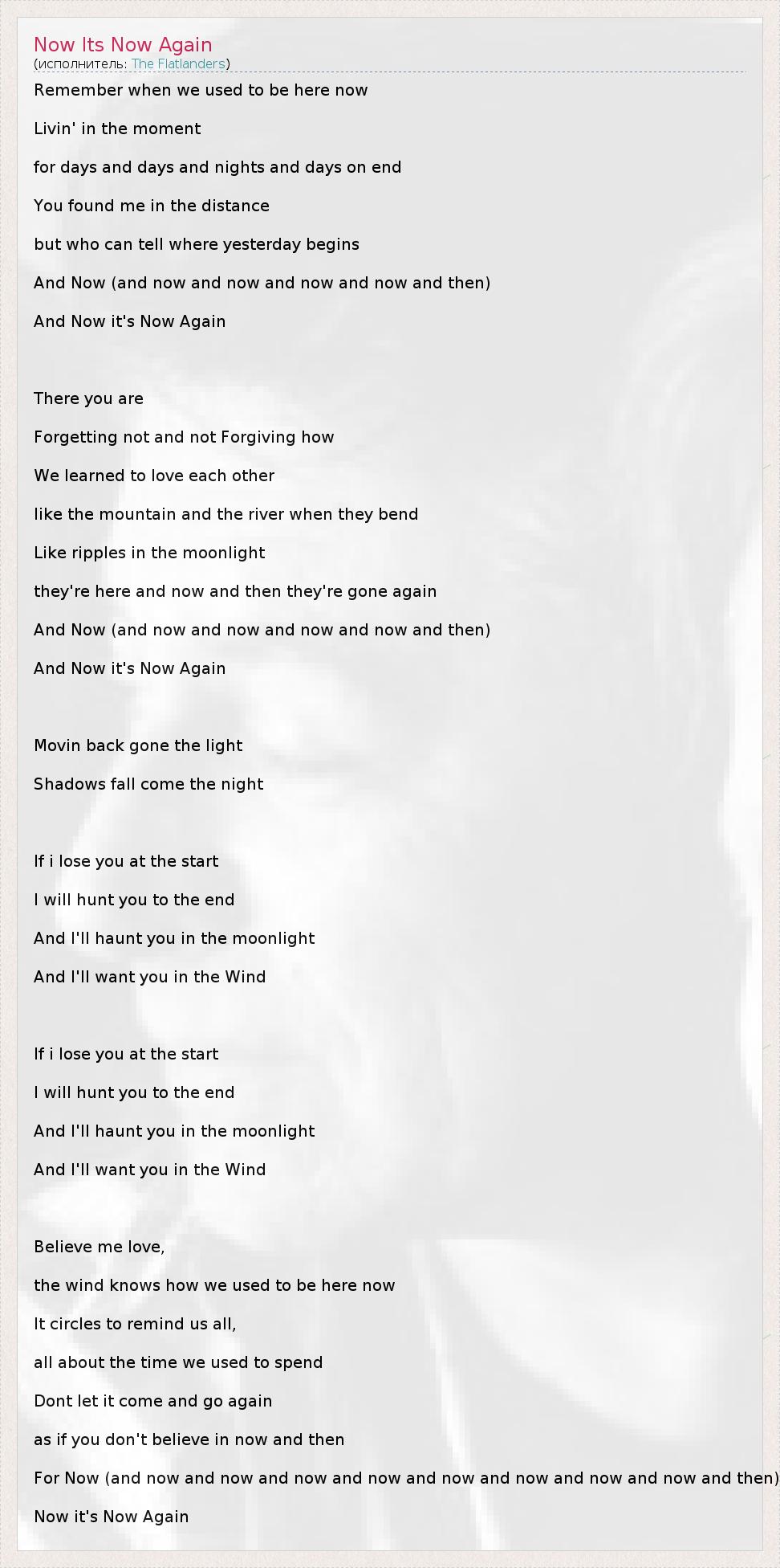 Remember when we used to be here now Livin' in the moment for days and days and nights and days on end You found me in the distance but who can tell where yesterday begins And Now (and now and now and now and now and then) And Now it's Now Again There you are Forgetting not and not Forgiving how We learned to love each other like the mountain and the river when they bend Like ripples in the moonlight they're here and now and then they're gone again And Now (and now and now and now and now and then) And Now it's Now Again Movin back gone the light Shadows fall come the night If i lose you at the start I will hunt you to the end And I'll haunt you in the moonlight And I'll want you in the Wind If i lose you at the start I will hunt you to the end And I'll haunt you in the moonlight And I'll want you in the Wind Believe me love, the wind knows how we used to be here now It circles to remind us all, all about the time we used to spend Dont let it come and go again as if you don't believe in now and then For Now (and now and now and now and now and now and now and now and now and then) Now it's Now Again
