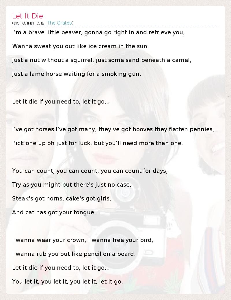 I'm a brave little beaver, gonna go right in and retrieve you, Wanna sweat you out like ice cream in the sun. Just a nut without a squirrel, just some sand beneath a camel, Just a lame horse waiting for a smoking gun. Let it die if you need to, let it go... I've got horses I've got many, they've got hooves they flatten pennies, Pick one up oh just for luck, but you'll need more than one. You can count, you can count, you can count for days, Try as you might but there's just no case, Steak's got horns, cake's got girls, And cat has got your tongue. I wanna wear your crown, I wanna free your bird, I wanna rub you out like pencil on a board. Let it die if you need to, let it go... You let it, you let it, you let it, let it go.