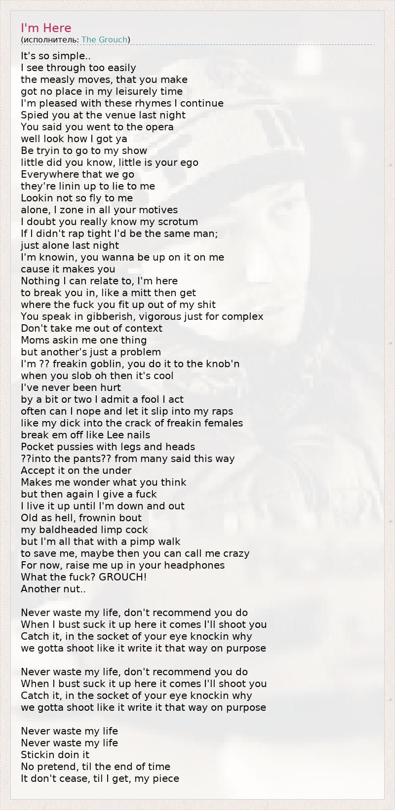 It's so simple.. I see through too easily the measly moves, that you make got no place in my leisurely time I'm pleased with these rhymes I continue Spied you at the venue last night You said you went to the opera well look how I got ya Be tryin to go to my show little did you know, little is your ego Everywhere that we go they're linin up to lie to me Lookin not so fly to me alone, I zone in all your motives I doubt you really know my scrotum If I didn't rap tight I'd be the same man; just alone last night I'm knowin, you wanna be up on it on me cause it makes you Nothing I can relate to, I'm here to break you in, like a mitt then get where the fuck you fit up out of my shit You speak in gibberish, vigorous just for complex Don't take me out of context Moms askin me one thing but another's just a problem I'm ?? freakin goblin, you do it to the knob'n when you slob oh then it's cool I've never been hurt by a bit or two I admit a fool I act often can I nope and let it slip into my raps like my dick into the crack of freakin females break em off like Lee nails Pocket pussies with legs and heads ??into the pants?? from many said this way Accept it on the under Makes me wonder what you think but then again I give a fuck I live it up until I'm down and out Old as hell, frownin bout my baldheaded limp cock but I'm all that with a pimp walk to save me, maybe then you can call me crazy For now, raise me up in your headphones What the fuck? GROUCH! Another nut.. Never waste my life, don't recommend you do When I bust suck it up here it comes I'll shoot you Catch it, in the socket of your eye knockin why we gotta shoot like it write it that way on purpose Never waste my life, don't recommend you do When I bust suck it up here it comes I'll shoot you Catch it, in the socket of your eye knockin why we gotta shoot like it write it that way on purpose Never waste my life Never waste my life Stickin doin it No pretend, til the end of time It don't cease, til I get, my piece