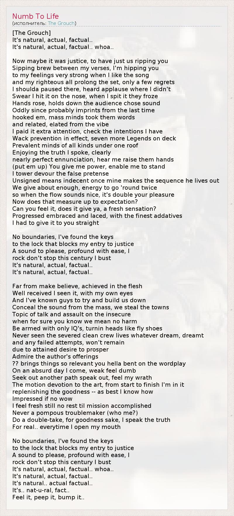 [The Grouch] It's natural, actual, factual.. It's natural, actual, factual.. whoa.. Now maybe it was justice, to have just us ripping you Sipping brew between my verses, I'm hipping you to my feelings very strong when I like the song and my righteous all prolong the set, only a few regrets I shoulda paused there, heard applause where I didn't Swear I hit it on the nose, when I spit it they froze Hands rose, holds down the audience chose sound Oddly since probably imprints from the last time hooked em, mass minds took them words and related, elated from the vibe I paid it extra attention, check the intentions I have Wack prevention in effect, seven more Legends on deck Prevalent minds of all kinds under one roof Enjoying the truth I spoke, clearly nearly perfect ennunciation, hear me raise them hands (put em up) You give me power, enable me to stand I tower devour the false pretense Unsigned means indecent once mine makes the sequence he lives out We give about enough, energy to go 'round twice so when the flow sounds nice, it's double your pleasure Now does that measure up to expectation? Can you feel it, does it give ya, a fresh sensation? Progressed embraced and laced, with the finest addatives I had to give it to you straight No boundaries, I've found the keys to the lock that blocks my entry to justice A sound to please, profound with ease, I rock don't stop this century I bust It's natural, actual, factual.. It's natural, actual, factual.. Far from make believe, achieved in the flesh Well received I seen it, with my own eyes And I've known guys to try and build us down Conceal the sound from the mass, we steal the towns Topic of talk and assault on the insecure when for sure you know we mean no harm Be armed with only IQ's, turnin heads like fly shoes Never seen the severed clean crew lives whatever dream, dreamt and any failed attempts, won't remain due to attained desire to prosper Admire the author's offerings ?? brings things so relevant you hella bent on the wordplay On an absurd day I come, weak feel dumb Seek out another path speak out, feel my wrath The motion devotion to the art, from start to finish I'm in it replenishing the goodness -- as best I know how Impressed if no wow I feel fresh still no rest til mission accomplished Never a pompous troublemaker (who me?) Do a double-take, for goodness sake, I speak the truth For real.. everytime I open my mouth No boundaries, I've found the keys to the lock that blocks my entry to justice A sound to please, profound with ease, I rock don't stop this century I bust It's natural, actual, factual.. whoa.. It's natural, actual, factual.. It's natural.. actual factual.. It's.. nat-u-ral, fact.. Feel it, peep it, bump it..