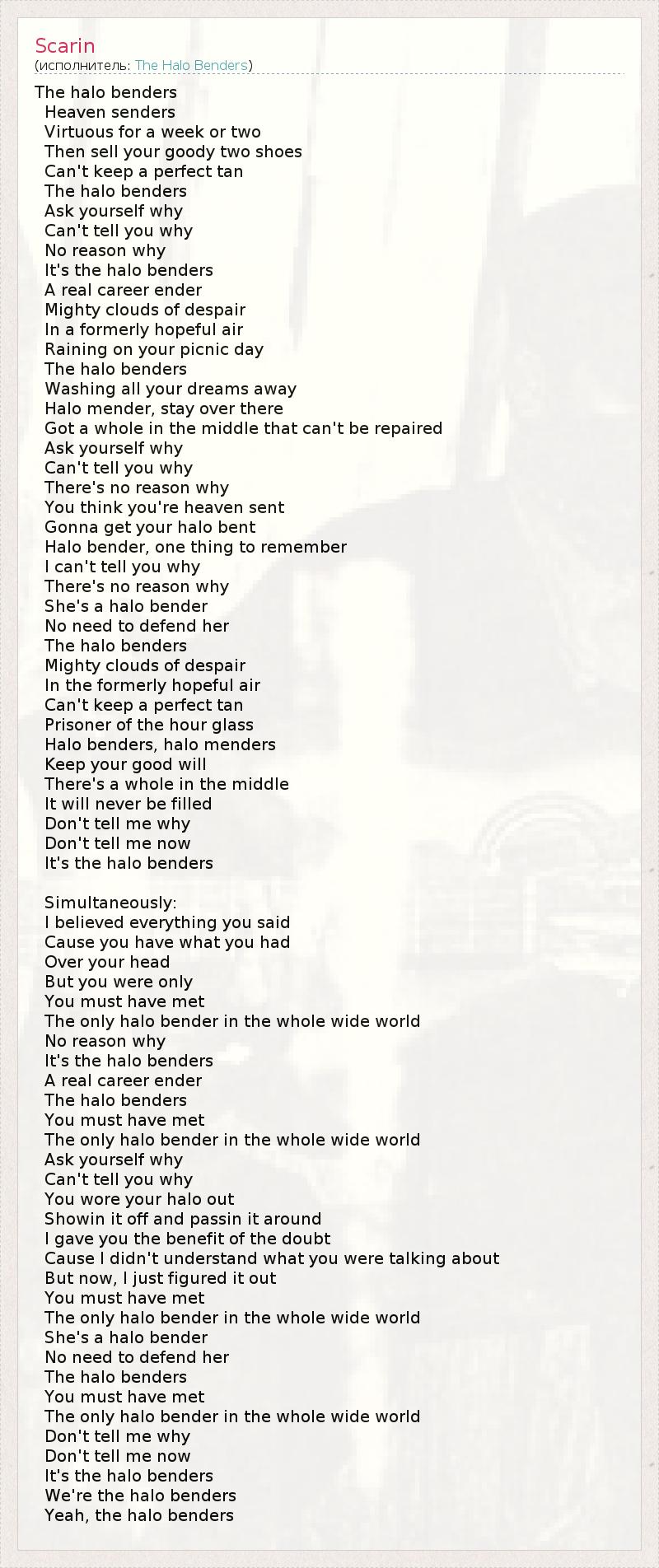 Это интересно:The Halo Benders - инди рок супер группа которая была сформирована в 1994 году Кельвином Джонсом из Beat Happening и Дагом Маршем из Built to Spill. В этом же году группа выпустиламвой первый альбом God Don't Make No Junk. Этот и все последуйшие лонплеи группа выпускала на лейбле K Records, а синглы Canned Oxygen и Don't Touch My Bikini вышли на Atlas Records и Fire Records соответсвенно.Группа распалась в 2000 и собралась заново в 2007 чтобы сыграть... продолжение